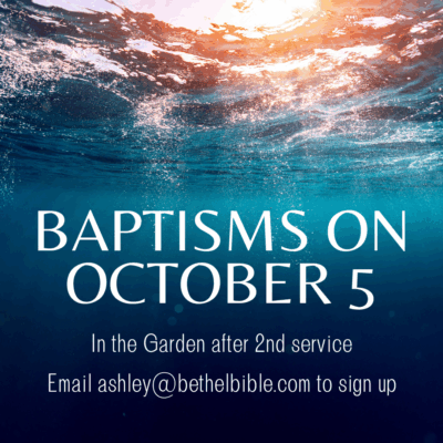 Join us Sunday, October 5, for baptisms and a party! If you are a new believer, a believer who’s never been baptized, or if your child has recently made a profession of faith, then we’d love to talk to you about participating in baptism with us. If interested, please email [email protected] to talk about next steps.