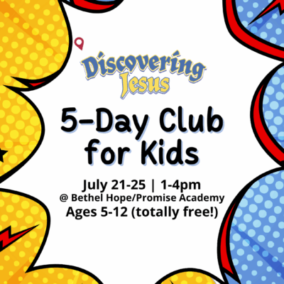 Discover Jesus! 5-Day Club at Bethel Hope! Games, crafts, snacks, and learning about Jesus. This event is for children ages 5-12, on July 21-25, from 1-4 pm in the afternoon. Questions? Email [email protected] or talk with Tracy Walker.