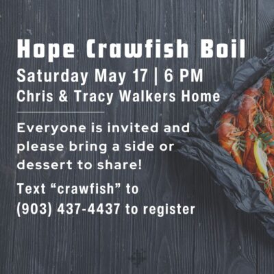 Come one, come all for the annual Crawfish Boil at Chris & Tracy Walkers’ house on May 17th @ 6 PM! Register by May 11 by texting “crawfish” to 903-437-4437. Chris will have plenty of crawfish and water bottles. Bring a side, dessert, or other drinks to share – and a lawn chair! If you have questions, contact Marty at [email protected].