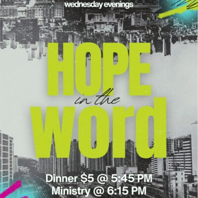 Join us for Hope In The Word! An optional meal ($5 a person 6th grade and up, 5th and below eat free) will be served at 5:45 PM, and the study will start at 6:15 PM.