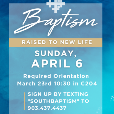 Baptism is an outward expression of an inward change. We love getting to celebrate these life-changing moments with our church family! Baptism will take place on April 6th. We will have a required Baptism Orientation on Sunday, March 23rd, during the second service at 10:30 AM in C204. Text “SouthBaptism†to (903) 437-4437 to sign up or CLICK HERE.