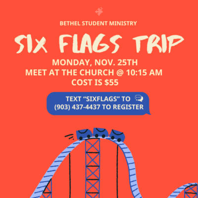 Join us for a fun day at Six Flags on Monday, November 25th! We will meet at the South Campus at 10:15 AM and leave by 11 AM. Cost is $55 and includes your ticket and lunch. Bring extra money for Buccees and dinner at Six Flags.