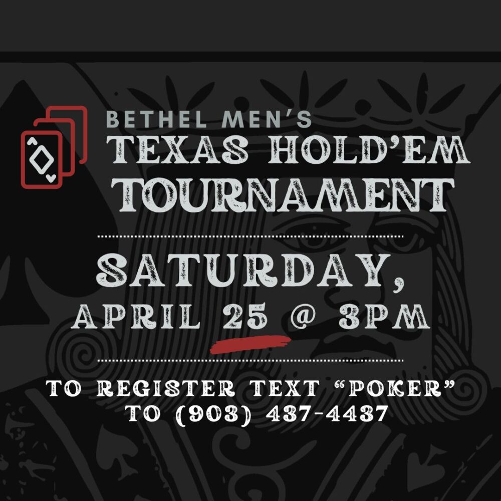 Men, join us for a Texas Hold’em Tournament on Saturday, April 25th at 3 PM! There is an optional $20 buy-in. Winner donates proceeds to one of Bethel’s local or global ministry partners. This is a great way to hang out and get to know other men at Bethel. Questions? Please email Chad Bradley at [email protected].